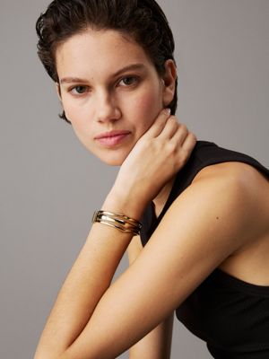 Sculptural layered shape in polished stainless steel. This bangle has a hinge closure and is finished with an engraved Calvin Klein logo.